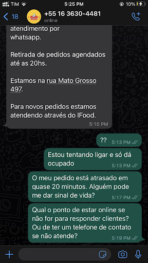 Read moreFiz uma encomenda para entregar às 20h e atrasou, tentei contato por telefone simplesmente eles não atendem apos o horário, sendo que internamente ainda estarão em funcionamento até q resolvemos ir fisicamente no local, e simplesmente alegaram que ndo fizeram a entrega por não ter motoqueiro nem se quer tiveram o trabalho de me ligarem para avisar pra saber se eu podia ir buscar ou então pra manter um bom relacionamento com o cliente não tinham um plano b para entrega, e fora q me enviaram opções erradas eu pedi tortinha de frango e mzndaram na caixa esfirra de frango, os valores dos centos são diferentes e so fui ver em casa. De sugestão mais comprometimento com o cliente pois tive convidados que tinham outro compromisso e não puderam aguardar devido a demora, sentimento...