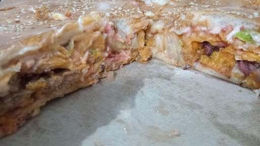 Um mega hambúrguer, com tudo o que você imaginar, com aquele saborzinho do molho do big, 6 hambúrgueres, com um pão gigante, do tamanho de uma caixa de pizza, muito bom.