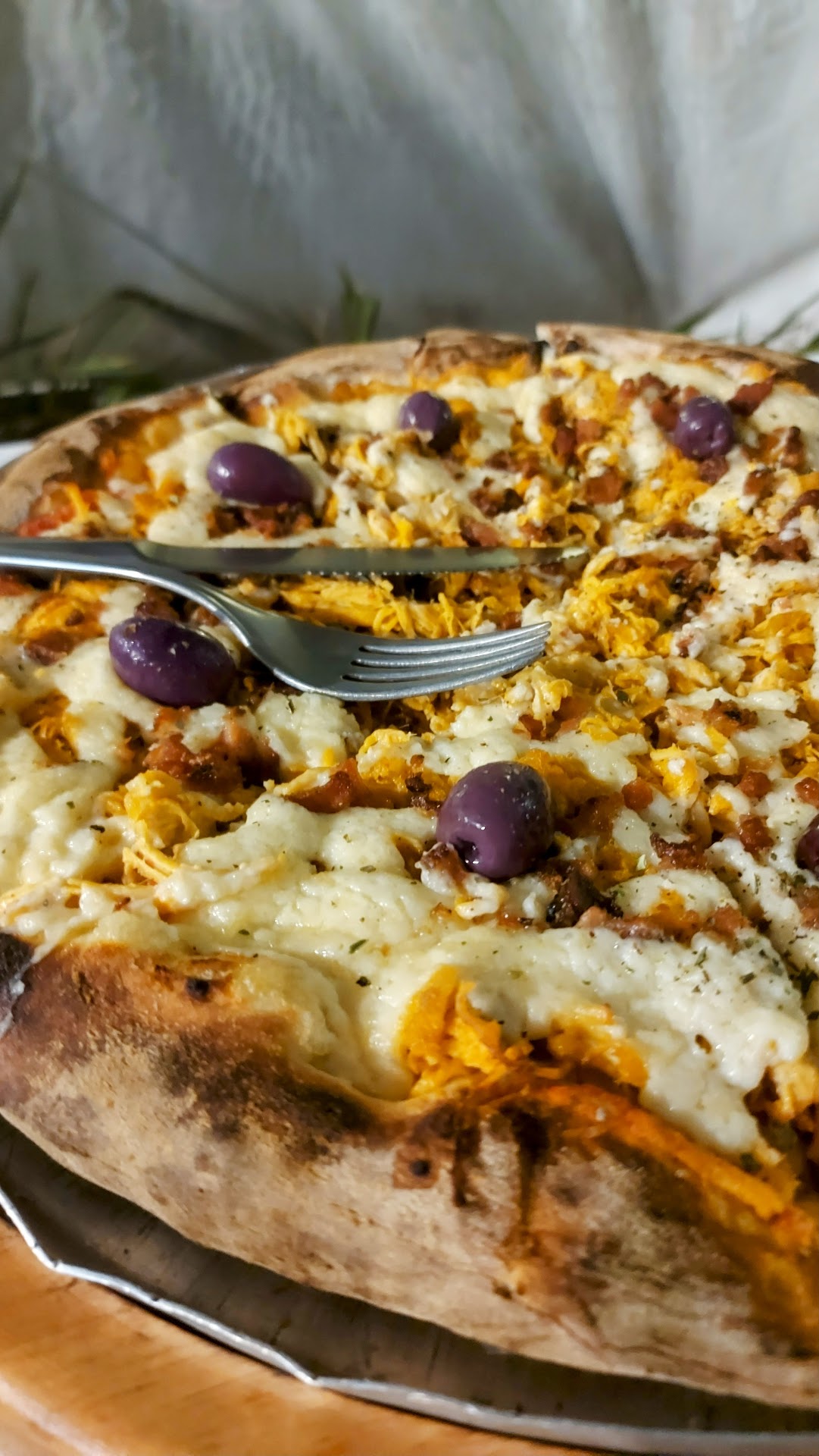 🍅 A margherita já é sensacional, mas também pedimos a de frango com catupiry e azeitonas pretas – e que surpresa boa! O frango vem suculento, nada ressecado, bem temperadinho... Só provem! 😍🐔🫒