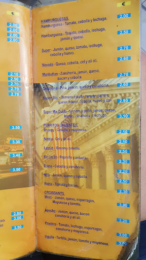 Restaurante de comida rápida pero económico y con platos bien, bien, bien serviditos. Y si no, atrévanse a pedir el croissant completo, o alguna de sus hamburguesas. Es muy conocido y popular entre los vecinos , y si no, vean cómo se pone los fines de semana con gente esperando su pedido para llevar. Y no es para menos. En cuanto al local, es discreto, con unas 7 u 8 mesas, aunque en la sala interior llegue regular la cobertura de orange. Su fachada tampoco destaca entre las demás, pero les animo a degustar sus cuantiosos platos. Usted y yo sabremos por qué repetimos en "...