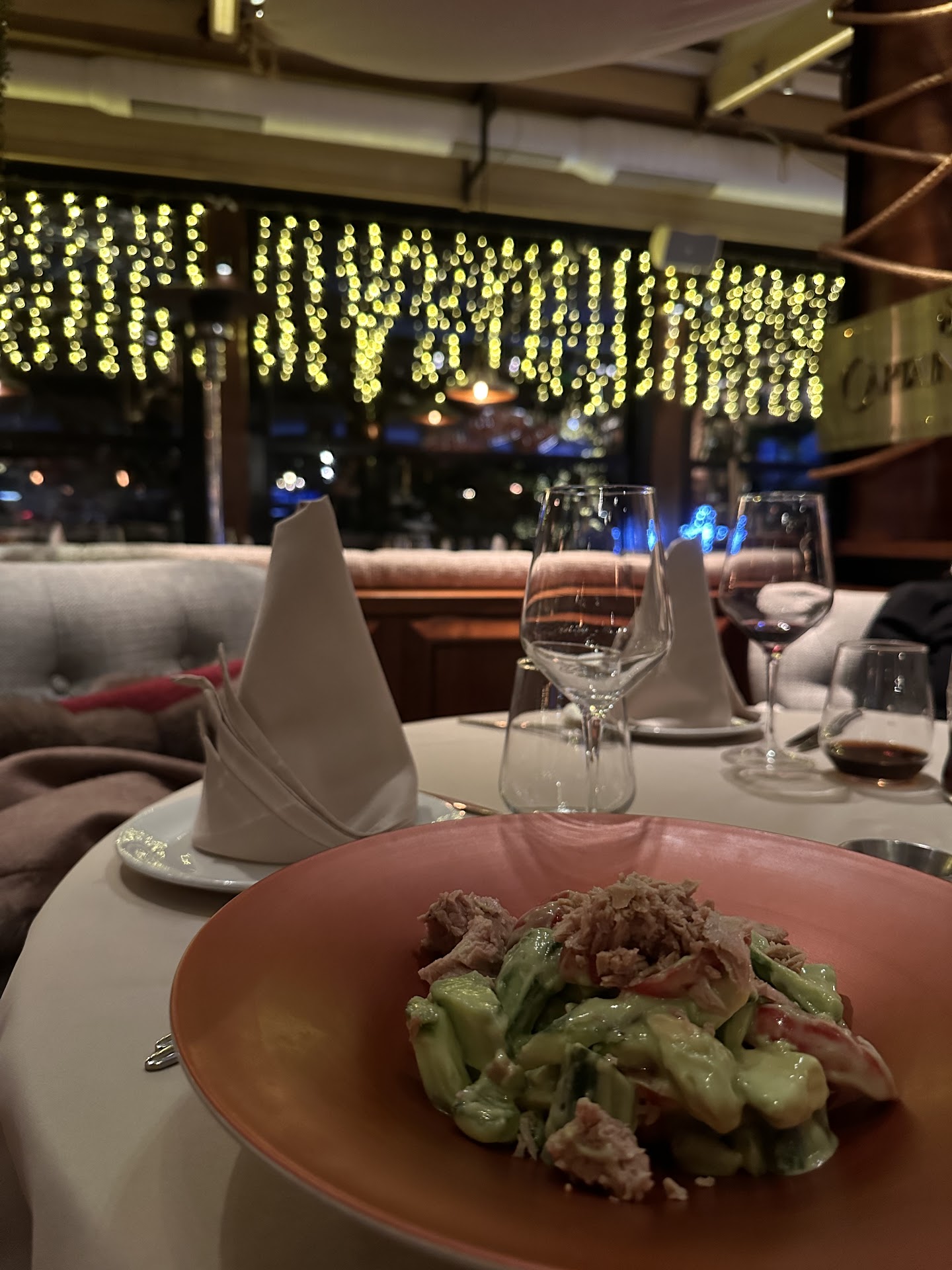 I ordered a 25 euro black angus steak with pepper sauce. Also ordered a side dish of barbecued peppers. My girlfriend had a tuna steak with truffle puree, shrimp with chilli mayonnaise, and we shared a side dish of roasted vegetables.