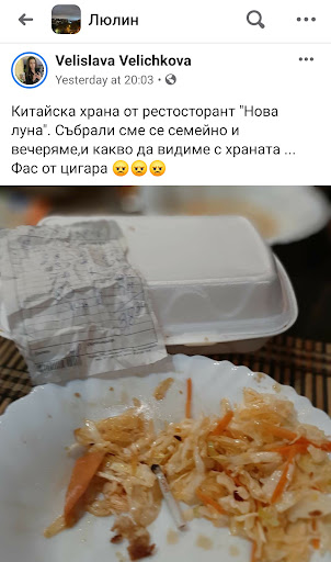 Read moreОнзи ден баща ми поръча китайско от Нова Луна,не знам за другите хора,но преди години чух че при поръчка от този ресторант, хората са си намерили стъкла в ориза,не вярвах на това защото всеки път си вземахме от там за вкъщи,до преди да хапна от ориза и да чуя хрупащото усещане в устата ми, и какво да видя пломбата ми падна заради парче стъкло. Така оставих ориза на страна и отхапах от хапките с сладко кисел сос и месото беше синьо и развалено.😱😖🤢🤮🤮🤮🤮 Никога повече няма да ям там!!!! Ако беше дете което да го беше глътнало а не сдъвкано какво ще стане?! Това е отвратително и не морално! Ако ще правят храна за животни да се...