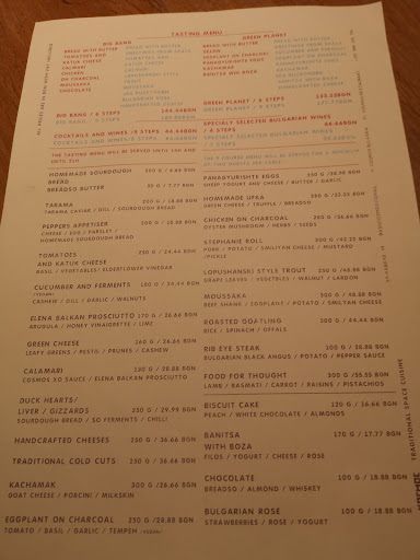 Read moreIf you seek a Michelin star experience this is not recommended. Given the high pricing - especially for Sofia - the food and service does not stand up to it. The ATMOSHERE is of a cool modernist warehouse design true to a cosmic concept, yet a bit rough altought the seating (except for the bar) was comfortable. the lighting was too reflective on the menus making their reading tough. Since we only had 90 mins before the next booking, we started at the lower level main dinning area and 60 mins later we were moved to the front/upper level bar area, yet our table stayed empty for 75 mins, so we could had stayed and finished there. SERVICE : We lost some valuable time at the ordering as the menus (colors, structure, type face, set menus) were not well written, riddle based, (no sections for starters, mains, desserts) difficult to digest and a heavier "selling" of the set menus at the top. We had two waiters who tried to explain the menu, yet for such type of abstract innovative food, their English was not up to the task and they seemed annoyed, rolling their eyes when we kept asking questions. Our dinning experience was saved when we got a bar waitress to attend to us and then she (Plammena) kept serving us at the bar and she was very good, polite, helpful with good English skills FOOD: we had the 9 steps big bang meat menu and the 6 steps green planet menu, as we were not allowed to have the 9 steps menu for two. The menus were matched with the 4 steps Bulgarian wines (which were good). Some dishes were very good (ie tomatoes and katuk cheese, trout, chicken) others were a let down (ie the moussaka, the eggplant w lentils, the eggs dish, the calamari with XO sauce and prosciutto which was tasty but too salty). Overall eclectic dishes , unsure of Bulgarian roots, in a presentation to impress, yet flavours that do not really excite (the desserts are an exception,) , especially for the price (we paid 190 euros for 2!). I figured that if we had ordered the same dishes in larger portions a la carte, we ld had paid only 15 euros more, so I recommend the a la carte option, although paying 25 euros for a moussaka that is upside down with a torched bechamel sauce, yet blunt, is not recommended. Overall an unusual, edgy dinning experience that left us with a heart burn and very thirsty (excessive salt) yet a cosmic one, as the name implies. The basics are there but a focus is needed on less complexity, more taste, better service so as to do justice to the...