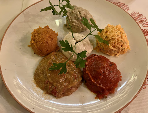 Read moreMoma is elegant, chic, and artfully decorated. Its menu offered a modern take on Bulgarian dishes, and we started with the Traditional Bulgarian Appetizers, a plate of six homemade dips including lyutenitsa (a sweet tomato pepper relish), kyupoolu (a spicy eggplant relish), shredded carrots mixed with cheese/yogurt/dill, a garlicky eggplant dip, a bean/chili dip, and tarama fish caviar. Each of these components was distinct, and everything came together to make a nice sampling of many different flavors and textures! For our mains, we had the not-so-creatively named “Our Local Dish in Bread Bowl,” a stew of chicken, pork, onions, mushrooms, peppers, tomatoes, and spices, served in a crusty bread bowl. The stew was hearty and delicious with plenty of flavor from the chunks of meat and the slow-cooked vegetables. Finally, we had the Roasted Duck Leg in Dough, prepared according to an authentic 1940 recipe from the Bulgarian King’s kitchen. This was a dish of shredded duck leg in a stew of eggplants, tomatoes, garlic, onion, and thyme, all covered with dough and baked. The meaty, tender duck leg paired nicely with the sweet, savory, acidic flavors of the tomato stew, and the dough on top was baked into a crusty bread perfect for mopping up the sauce. Overall, the dishes here were beautifully presented and delicious, though the artistic setting was...