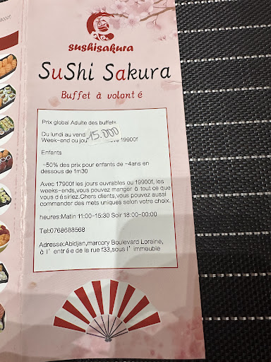 Sushisakura: Le restaurant n’est pas des plus class mais à tout ce qu’il faut. La nourriture est très bonne. On peut commander à la carte (ce qui reste moins avantageux vu les prix) mais il y a la possibilité de payer pour un buffet à volonté à 15.000fr et vous pouvez commander tout ce qu’il y a sur la carte ou demander au chef de vous concocter divers menus de son choix pour plus de suspense. Seul condition il ne faut pas gaspiller la nourriture. Donc tout plat commander doit être finis sous peine de payer 5.000fr comme amende. Il y a beaucoup de sushi avec le poisson cru mais aussi des repas avec des fruits de mer cuit ou du poulet. Donc tout le monde a pour son compte, des moins jeunes aux plus petits. Le restaurant est adapté aussi pour les végétariens. Ils ont aussi du saké que je trouve bon à 5.000fr ou 8.000fr. Côté propreté ils doivent faire un peu plus, on sent un léger laisser aller, mais l’endroit...