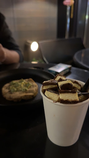 I enjoyed the Zafran Cake, paired with grapes and mango smoothie and a chocolate-poured coffee. The Zafran Cake is a must-try, blending rich saffron with sweet, flavorful ingredients. The café is a social-driven specialty coffee place, and their coffee is amazing. The location has a cool vibe and stylish décor, and if you like a quiet, cold place, this can be a great spot. However, they could improve the lighting a bit. Overall, a lovely experience.