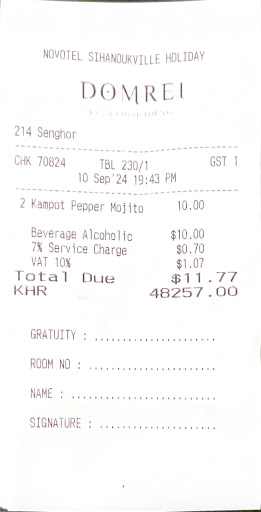 I recently visited Domrei Bar & Cigar Lounge during a trip to Sihanoukville, eager for some downtime at what was advertised as an indoor cigar lounge. However, upon arrival, I discovered the lounge is not a standalone venue as shown on Google Maps but is located on the second floor of the Novotel Hotel. I’ve since corrected this on Google Maps, but this oversight from management is worth noting, especially for a hotel chain like Novotel under the Accor brand. Clear and accurate information is key to a smooth guest experience, so I would suggest they address this.