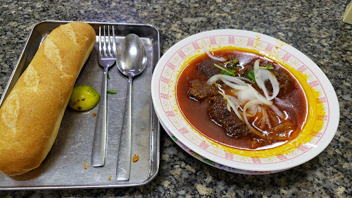 Very inconsistent food!!! 14500 riels with an iced tea. This is typical in Cambodia.. once a restaurant is gaining enough customers they'll lacked in taste and service. ps: hygiene is not their goal!!! As for the bread, rock hard dehydrated to the max. Compared to "Phú Quốc", it's like heaven & hell! All their baguettes in Phú Quốc from a few restaurants I've been are at least 90% fresh and their "Bò kho" is never ever slimy like this restaurant! Probably by adding cornstarch.. Contrary this beef stew "Bò kho" imitation has no carrots and is served with a tiny bit of rice paddy herb. {Traditionally Vietnamese beef stew is served with some culantro & Thai basil!} It's obvious to me because in Cambodia, the rice paddy herb is probably the cheapest but culantro is the most expensive. Oh, the piece of lime is super fresh! Sike..
