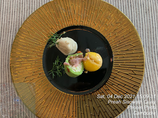 Read moreA hidden treasure that I nearly missed had my colleague not invited me on this dinner trip! It’s a really fancy place that offers Khmer fine dining using I think locally sourced ingredients and let me just say, the freshness can be felt with every bite!! Here’s what we got: seafood sharing plate: bursting with the juiciest most succulent chunks of prawn and squid, this dish was more than enough for 4 of us to share. Caramelized duck: one of my favorites: the duck meat was fall-off-the-bone tender and braised with the perfect level of sweetness. Very Chinese style, and we loved the addition of lotus root and mushrooms. king prawn amok: one of my favorites too!! The sauce was like a very coconutty curry infused with lemongrass. Once again, their prawns are chefs kiss so so incredibly juicy and plump!!! Beef with green curry paste: a very interesting combination that surprisingly felt very clean, probably from the fresh eggplants and basil Don’t miss out on the desserts here!! We got the Pandan cake, chocolate sphere and apple tart. The highlight for me was the chocolate sphere which was dark and rich and so harmonious with the hot sauce and ice cream that came with it.