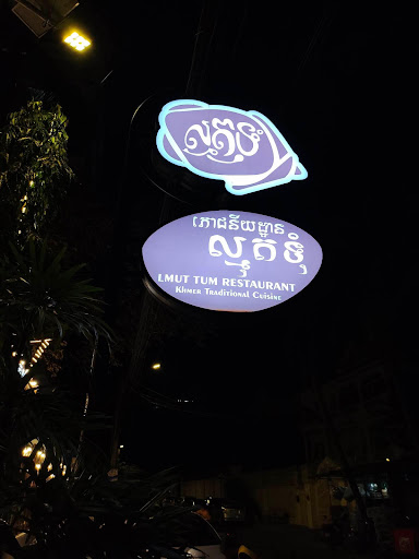 This restaurant is called "Lamut Tom" (ripe sapodilla fruit). I believe it is an old Khmer villa that has been retrofitted as a restaurant. The rooms have lots to look at as there are bits of Khmer culture all over the place. It is a brilliant place to take visitors to the kingdom. The menu is quite extensive from bugs to frogs, and field crabs to fish amok. The prices ranged from $5 -$15 a plate. We reserved the air-conditioned room upstairs, but there were several eating areas (one had padded mats were you reclined). The staff were professional and prompt. I enjoyed the amok and the korko soup served in a coconut. We went for supper, and the bar next door was doing Karaoke at very high volume. For that reason, it might have been better to eat in another room. Check it out, I’ll be back...