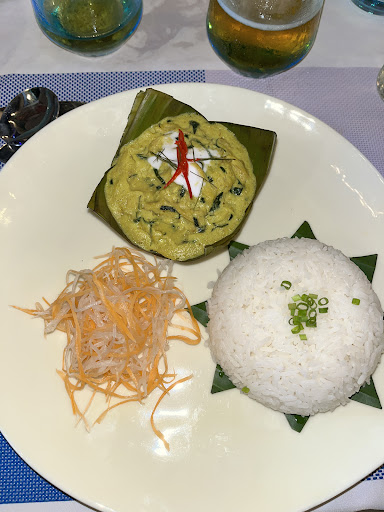 My husband had kapot green pepper with shrimp and a mojito and I had Luk Lak beef. We shared bananas flambé for dessert. I had a blue margarita. The presentation was spot on for any first class restaurant and the taste was superb. I am picky about my beef (from the US) and this Australian steak was cooked perfectly. My husbands dish was flavorful and incorporated in some of the special pepper Cambodia is known for. In fact, my dish came with jasmine rice and also included a pepper sauce.