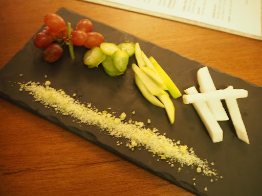 The head chef came out to offer us a plate of fruits on the house. There were grapes, tree cucumbers, green mango and soft coconut slices. The most interesting thing was that the fruits were paired with chilli sugar. Upon tasting, it really was more like Tom yum sugar. The grapes were sweet. However, the tree cucumber was quite acidic and sour, a taste which was alleviated with the sugar. I thought it was great that the chef chose tree cucumbers as it is hard to come by in other cuisines.