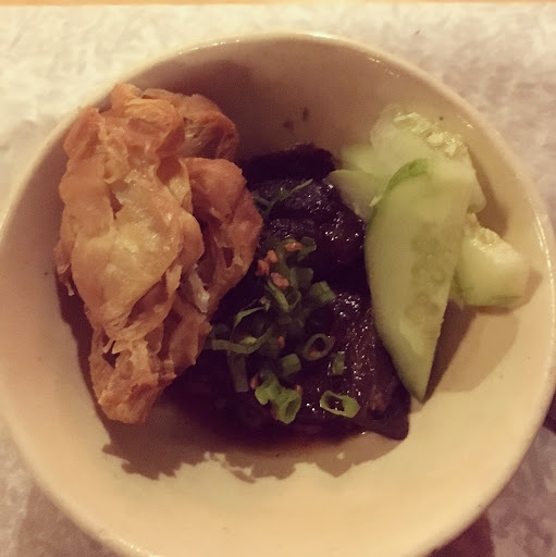 The rice pancake with minced pork and breast was pretty good. There was a small piece of rice cracker in the middle. The exterior was crispy. The minced pork ball was tasty and had a hint of ginger in it. The breast was thinly sliced and seared well.