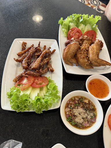 Food was delicious and satisfied my taste buds. We ordered the pad see ew and added beef, crispy pork belly, chicken wings, papaya salad Laotian style, and sticky rice for dinner. Everything tasted perfect except I would say as a Khmer person myself, the pad see ew lacked some flavor, but still edible. For desert, we got the mango sticky rice and coconut ice cream. The mango sticky rice wasn’t as good since the sticky rice was a bit hard. The coconut ice cream was phenomenal!! They add peanuts on top so if you’re allergic I suggest you tell them to omit, but it was the perfect combination with the coconut flavor! It was right around the corner from our hotel so we will definitely be returning! With all of that food, we spent less than $25 total. Reasonable pricing with good food and atmosphere. (Photos are from lunch...