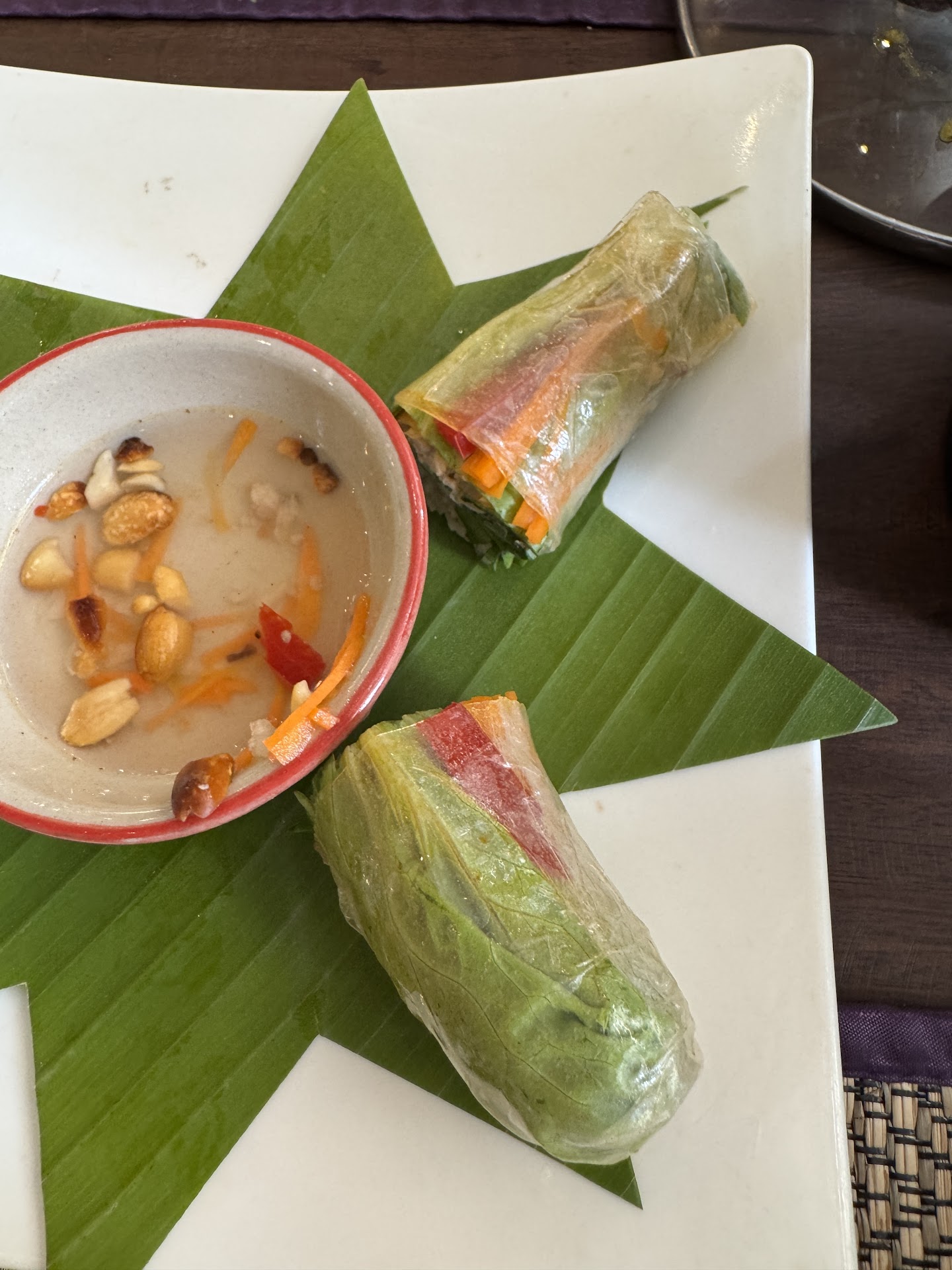 We’ve ordered: wok fried vegetables with oyster sauce ($3,00): very fresh, just perfect!😍 wok fried beef with Kampot green pepper ($3,50): very good! seafood wok with Kampot pepper ($3,50): nice flavours, but a little to small portion. wok friend chicken with spring onion ($3,50): very good taste of meat! Tom Yam soup with prawns ($3,50): perfect taste, perfect spicy you have to order it🥇 crispy spring rolls ($2,50): also very very good. signature seafood amok ($3,90): delicious local dish....