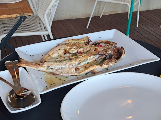When the fish of the day was offered, the server who explained it was actually very nice and knowledgeable, so we ordered two to share. Unfortunately, they managed to completely ruin what was clearly a high-quality fish—it was unsalted, tasted boiled, and was full of scales. We paid €80 per fish, and all it came with was a tiny bowl of fries and some boiled vegetables.
