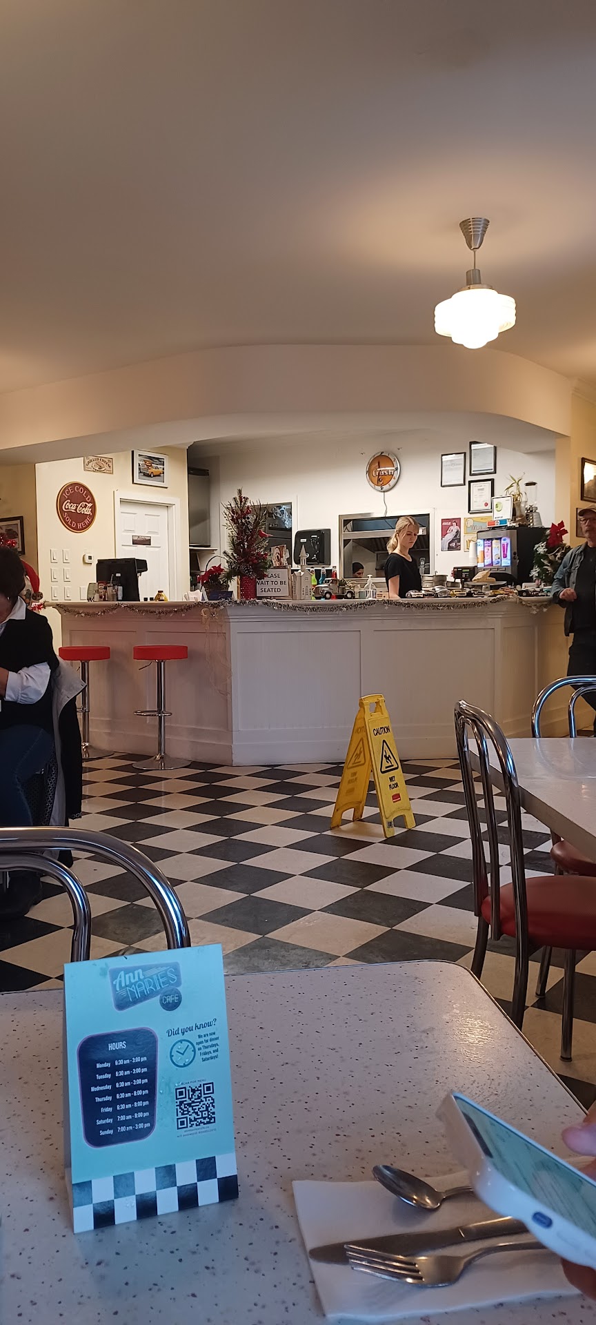 Sorta tucked into a little alley just off George Ferguson, Ann Marie's is a pretty cooly decorated 50s style Cafe complete with black and white checkered floor tiles and red vinyl booth seating as well as alot of car decor on the walls.
