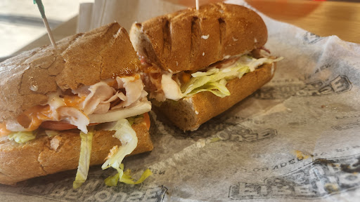 When I came in, I wasn't acknowledged for quite a while. Finally, one of the 4 people in the kitchen called the guy over to take my order. Judging by what I see, most of their business is take out. Drivers constantly coming in and out. I was excited to see a coke freestyle machine, but it's not working. Forcing us to buy more expensive drinks. I ordered a Turkey Bacon Club. He confirmed the topping with me and the pickle on the side. I also ordered a bottle of sprite. I went to sit down on one of the padded seats, and the 5 tables along that wall were all dirty. There are employees constantly walking past to use the bathroom, but not once did someone come to wipe the tables. My sandwich arrived and it looked very nice. I did notice that the pickle the gentleman confirmed with me, was not anywhere to seen. I took my first bite and was a bit surprised with the ranch. It didn't taste like most peppercorn ranch I have had in the past. It tasted like a grocery store branded ranch. It was really heavy on there too. I couldn't really taste much more than that. I will stick to Quiznos, their customer service is way better and tables are cleaned more often. And $12 for a med sandwich, not worth it...