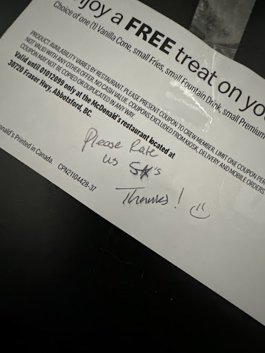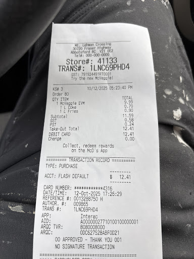 Read moreI went through the drive-through the order of the meal from the McDonald’s and the first window took the payment from me and I got the confirmation like the payment is deducted from my account and even the window one whoever was working, confirming the payment has been made, but when I went to pick up my order and they said the payment didn’t go through and even I show them the transaction history like the payment done it from my end that’s your issue and they were complaining like they can’t give me the food until I met the second payment and forced me to do it very very bad. Behave by the McDonald’s staff and they said end of the month you can check your transaction if you didn’t get the refund I can come back and get the refund. That’s not good for me. I am living in surrey and this McDonald’s is in Abbotsford and they want me to come 40 km to get...