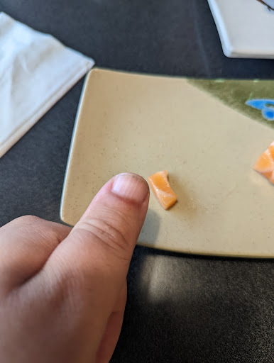 and when it finally came out... i’ve seen thicker pages in a bible. i’m talking about cuts of sashimi like they were crudely chopped to all tiny and odd shapes under a microscope. 40 pieces if you squint, but more like 20 if you use your glasses.