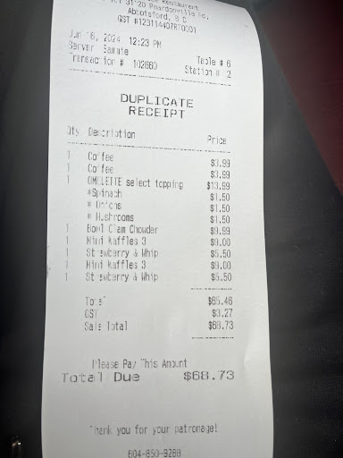 However, the bad service continued. She came to our table a total of three times over the course of two hours—once for drinks, once to take our food order, and once to bring our food. All of this was late. She never asked if we wanted a coffee refill or brought us any condiments.