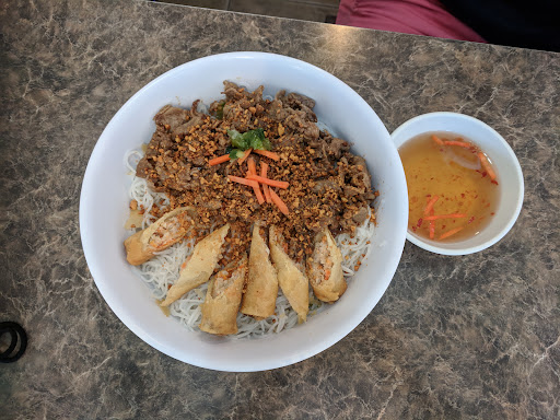 I ordered charbroiled beef and spring roll vermicelli. The spring rolls were nice - the best part of our meals, but it was mostly noodles with no flavour. There were no bean sprouts, no carrots, and only a tiny bit of lettuce. The charbroiled beef tasted like it was boiled. It was flavourless. I’ve never had vermicelli that was primarily noodles. I’ve never had it without carrots or bean sprouts. The meat was bland, and the Nước chấm sauce tasted like water with a tiny bit of sugar in it. I couldn’t taste...
