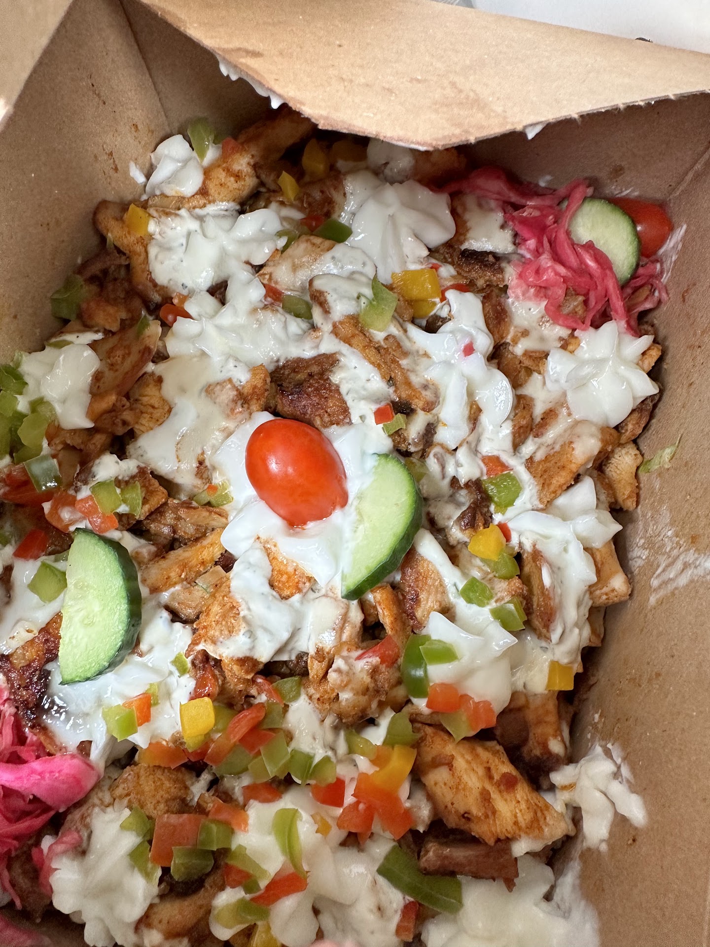 I had great expectations, and this was honestly one of the most disappointing meals I've had. We ordered 2 chicken shawarma wraps, and some donair fries. At first bite, I was struck by the chewy texture of the pita itself. Pretty unpleasant. Then I got to the meat, toppings, and sauces. Bite after bite, I was waiting to taste something. Anything. But alas, there was no flavour at all. Bland. Greasy. I don't eat much salt in my diet, but even I thought it was missing salt and, well, every other spice that is used in every other shawarma place I've ever been to.