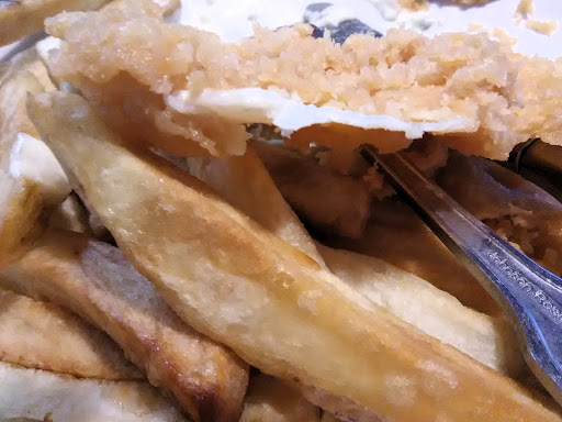 I don't usually take photographs of food, but I was sure that readers would think I was exaggerating if I didn't provide evidence. I had been here for fish and chips a few years ago, and it was OK. I had been out and really wanted fish and chips for dinner, so went here because I was passing by. The restaurant felt a bit odd when I entered, I was the only customer and the man at the counter didn't seem too enthusiastic about having a customer. It was the same dining experience that I remembered from the last time, little attention to comfort, but this time there were the added negatives of loud pop music playing, flashing, coloured rope lighting and thick plastic stuck to the windows, in a soliltary confinement style of making it impossible to look outside. The halibut and chips took quite a long time to get to the table, but when it did arrive it looked delicious. My first taste of the chips was a pleasant surprise, they tasted like chips. The fish looked good too, thick fluffy batter and they hadn't economised on the portion size. I also loved that they gave me a full container of tartar sauce. When I cut into my fish and took my first bite, it was very oily, a bit tough and very thin - no worries, it could have been cut close to the tail, as sometimes can happen, so I took another bite and got the same thing. I started to check each piece of fish on my plate, lots of batter, but hardly any fish. It looked like the fish had been sliced on a meat slicer, it was so consistently thin and looked around the thickness of regular sandwich meat, around 2 mil thick. I ate a few more chips, but I couldn't eat any more than the two bites of greasy batter. I thought this might have been an anomoly, so I asked my husband how his fish was on his fish sandwich. It only slightly thicker. The man at the counter never came to ask if we were satisfied with the meal so when we went to pay, I told him about the fish - he looked unphased and confirmed it was what they normally serve: 4 oz of fish. It may have been 4 0z incuding the batter, but that is still far less fish than every other fish and chips I have ever been served. It was so thin it looked like a thick sheet of paper, not enough fish to know that there was fish present inside the batter. I asked for a refund or discount, the man said he wasn't allowed. This explains why the 'restaurant' was so empty at...