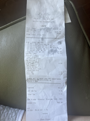 Read moreWorst KFC experience in my life and I used to manage KFC stores. I would avoid this store at ALL costs. Placed 2 small online orders. Went to pu and found only drive-thru open and had to wait behind 8 cars to get order. Spent 20 mins in line just to pu. Explained I didn’t want old chicken and old fries since my order would have been sitting for 30 mins+ cuz having to wait in line. They offered what was supposed to be fresh chicken only to find it was not dark meat but they changed it to white meat making it seem it was fresh, but it wasn’t. Then was told it would only be 5 mins for fresh chicken/fries. Waited at front parking lot 20 mins. Was to be two orders but they decided without asking to put both in one box. Was on my way to work and dropping other order to friend. I now had to go home and repack so I could take mine to work or wait another 10 mins for them to put in two boxes. Not even napkins with greasy chicken/fries. My FAST food order took 50 mins in total to get. Staff were rude and lied to try to give me old food when they said it was fresh. NEVER go to this store. They are TERRIBLE to try to...
