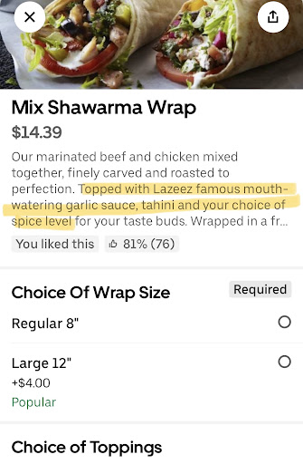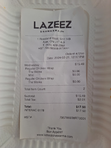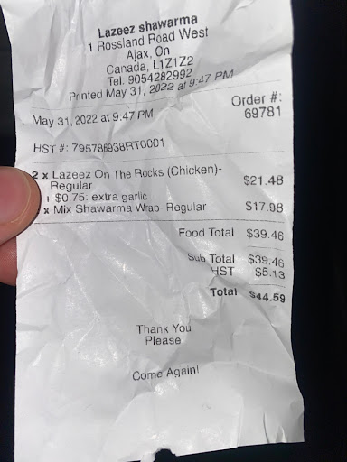 We placed an order through Uber eats it said 15-25 mins to receive the food. Our order was mixed grill platter & the chicken salad. Uber then put a delay by the resturant so we waited 40 minutes in total for our food to arrive, when the food arrived the platter only had 1 kofta and 2 small pieces of chicken souvlaki! No chicken shawarma and only two small pieces of the chicken souvlaki! The entire plate was just rice! The food was cold! We then called lazeez in Ajax to complain, all they offered was to replace the missing meat from the platter. She said I have to drive to the restaurant myself, when I ordered food in the first place to prevent myself from leaving the house due to COVID-19.