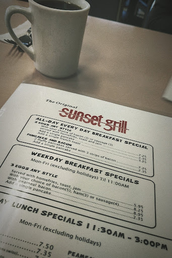 Sunset grill has timely severs and cooks who take pride in what they serve and take great care in your dining experience. They are very friendly and really wish to learn about what their customers enjoy most about being there.