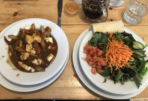 The side salad was perfect: fresh mixed baby greens with tomatoes, cucumber, and grated carrots on top. It came with a 3” piece of baguette with butter. The poutine was not remarkable: cheese wasn’t at all melted, the gravy was fine but nothing special in flavor, and there was so much gravy it was like French fry stew. The elk burger was good. The chicken fingers are what you’d expect. The split pea soup tasted homemade - truly delicious! The roast beef sandwich came on white bread (not sure if there was a choice) and my brother-in-law loved it. The fries were very tasty. The IPA (sorry, I don’t remember which one) had a lovely fresh hop aroma and a fair level of bitterness — delicious. We all enjoyed our meals.