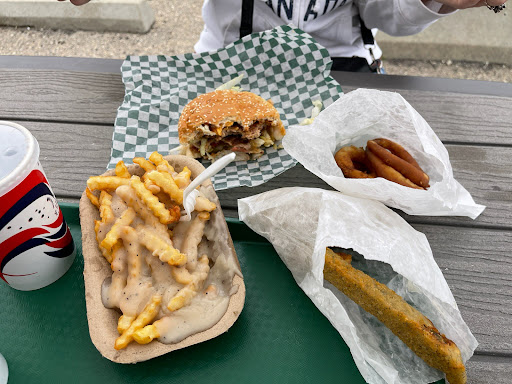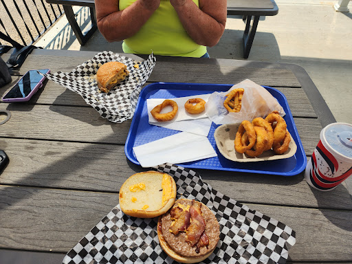 My partner n I stopped in here this time because so many folks recommended this place and so today was the day. My partner n I ordered a Cheese burger special and added bacon and a Mushroom burger with Onion rings and fries and a drink. It is a nice drive in outside seat type establishment and certainly hits that mark for me and the added touch is they have a dog bone treat jar with a water dish. Kinda cool so I'd say this place is Dog friendly and hopefully the dog owners can keep their pet under control from other patrons.