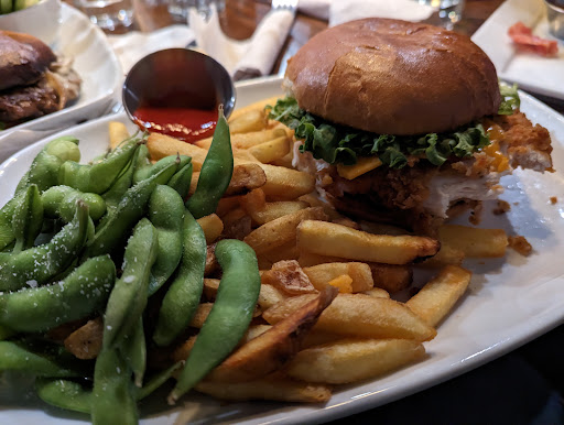 Each meal comes with the choice of 2 sides. I had The Big Easy which came with a huge piece of moist fried chicken, lettuce, tomato and cheese. I thought it could have used some sauce and added a bit of ketchup. I had the fries and edamame for sides and both were very good. My wife had the Forage Burger with mushroom, onions, truffle aioli, cheese but seemed to be missing the arugula. She had the tossed greens which came with a good dressing and the roasted corn which was spiced well but the corn overcooked (soggy). The Montreal smoked meat sandwich came loaded with shaved meat, my sister enjoyed her steak sandwich and brother in-law enjoyed The Father's Office. All liked the fries and edamame but same soggy corn all around.