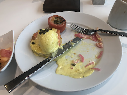 Read moreStaying at the airport before an early flight such a huge convenience but a good meal before a travel day makes it that much better. We ate here for supper and then again at breakfast. Expensive but delicious! I definitely preferred the supper though! Our family ordered, fish and chips, butter chicken, salmon and gnocchi, the burger, and Mac and cheese. Everything was fantastic! It is not a cheap meal but the portions are large and the food was amazing. My only complaint was that the restaurant was closed because they didnât have enough servers and we had to eat at short cocktail tables and swinging chairs.. which my kids loved but it definitely made for a lot of food on the ground and some drink spills. So overall the lounge is not family friendly and they wouldnât accommodate us in the actual restaurant. For breakfast we ordered the kids menu and the food was also great! Minus the sausage⌠it was super dry and bland. No one ate that. But the eggs, potatoâs and little pastries tasted fantastic. Overall, we loved this place and would come back. This time we wouldnât get sticker shock with the prices but just know, the food really is good and...