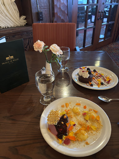 My boyfriend and I were very excited to eat here to end off our first trip to Waterton after a long day of hiking and exploring. The restaurant was very nice and cozy, and our waitress was absolutely lovely and personable, however it was an extremely disappointing experience. We waited over an hour for our food, if the restaurant was hustling and bustling it would be more understandable but it wasn’t. We were about to walk out after waiting so long and ready to just take our loss and call it a night with some pizza. I ordered the summer berry salad which was nice and refreshing but it was nothing special, a salad I could order anywhere and taste the same. My boyfriend had the “kenow” chicken, which was warm at best, bone dry, and the sauce with vegetables was tasteless. He says it was the worst meal he’s ever had at a restaurant in his life. We also tried the haskap berry and honey cheesecake which I enjoyed because I love haskap berries. We read on the menu the hotel was named the prince of whales in hopes of the then Prince Edward to visit, which he never did (wish we could say the same), which was a good thing as he probably would’ve hated it too. I’ve read the afternoon tea is good, overall I would not recommend this place. Not worth the price, not worth the wait, and not worth the time. Just go somewhere else, everywhere else we’ve tried in town was great. In the end we did pickup a delicious pizza from pizza of waterton and would highly recommend going...
