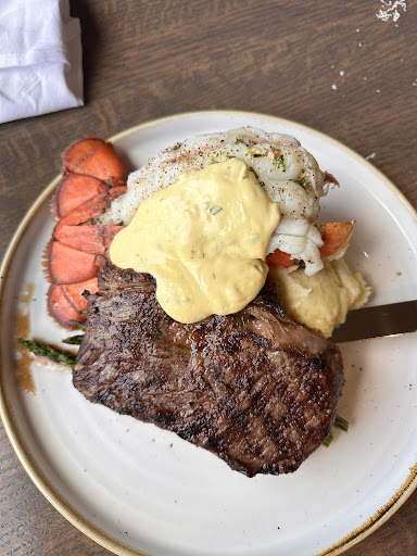 Steak was a definite miss. Do not get it. It's a 12 ounce loin strip and it was sooooo chewy and hard to cut. You know the steak isn't going to be good when you need to take a chain saw to it to cut it. I was extremely disappointed with the first bite. But I was hungry so I kept exercising my wrist and hacking away. There were soo many fat tendon pieces that I could not cut through and even if I did get it cut I couldn't chew through it. Lobster was good.