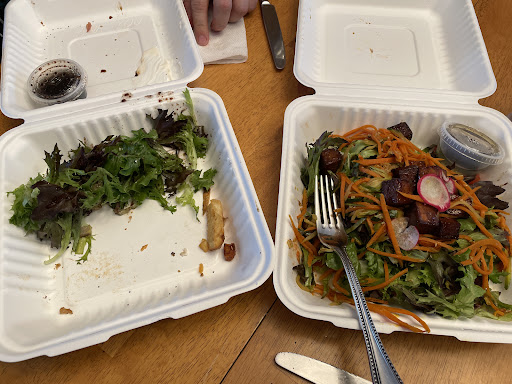 Read moreJ’aurais voulu prendre une belle photo du hamburger vegan et de la salade végane, j’aurais vraiment voulu vous montrer à quel point c’était appétissant… mais mon estomac s’est emballé et a presque tout mangé avant que je puisse prendre une photo. La galette de burger (aux haricots?) et les pommes le rendent unique et moelleux. Le tofu de la salade est super bien assaisonné et les légumes sautés sont parfaits.