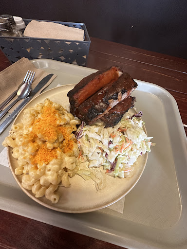 The food is the star of the show! I ordered a 1/2 rack of ribs and my spouse the smoked brisket sandwich with sides of baked beans, Mac and cheese, and apple coleslaw between the two of us. The meat was juicy tender and falling off the bone. The sauce perfectly compliments the smoky favours of the ribs having a beautiful tangy buffalo flavour without the heat! The Mac was the perfect amount of cheesy with a sprinkling of crushed cheese puffs on top really completes the homey feeling of this place. Not to mention the amount of food you get for the price!! Unbeatable!