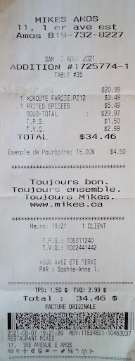 Parti dimanche de Val-d'Or pour Amos déjeuner au Mikes. Arrivé à 12:15h et le temps d'avoir nos assiettes une fois la commande passée fut de 1 heure 20 min. L'hôtesse nous avait mentionnée qu'il y aurait des délais mais nous étions loin de nous imaginer que ce serait aussi long. Si elle nous avait mentionné au départ que ce serait d'environ 1 heure, nous ne serions pas resté car on désirait aussi magasiner et avons vraiment manqué de temps pour le faire. La nourriture était 5 étoiles par contre mais avons dû manger très rapidement...