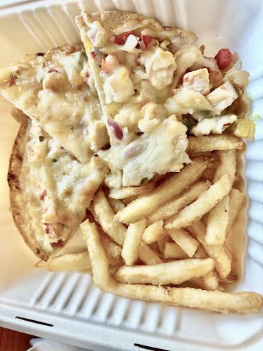 Not this day though. I placed an online order to be prepared for 12:30 pm. I was admittedly a little late, arriving to pick up my meal at 12:42. When I arrived there were three waitresses at the till, one of which asked if they could help. I told them my name and order, so which all three dispersed without saying a word, and me left extremely confused. After 7 long and awkward minutes someone showed up with my order, and I left. Back at my destination, I open my lunch to find uncooked fries (some are still frozen in the middle, and the flatbread to look completely different and have a soggy texture compared to the ones Ive ordered in the previously).