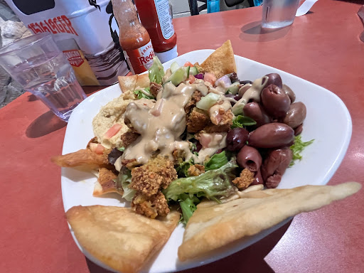 The food took a long time to arrive and once we did receive it was quite underwhelming. Pulled pork had nothing else on the bun - no cabbage, pickle, onions etc. The med bowl was packed with way too many olives and the falafel patty was pretty dry and tasteless.