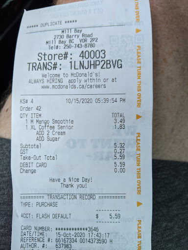 Read moreHands down, the worst Mc Donald's that I've ever eaten at. Dirty washroom with a dried booger on the tile wall; news paper strewn on the front counter; unswept floors even though there were no patrons in at the time; their condiment station was unstocked, and the catch tray for the ketchup was full. The food was also the worst I've had at any of the franchises. The mighty Angus was flat and bland and missing the tomato. My wife received the wrong burger and when they gave her the correct one, it was also missing the tomato.