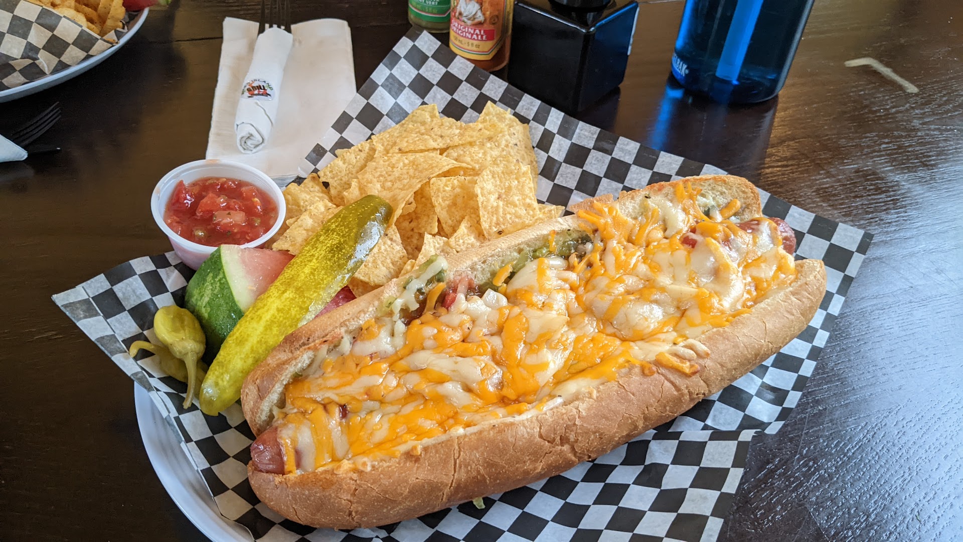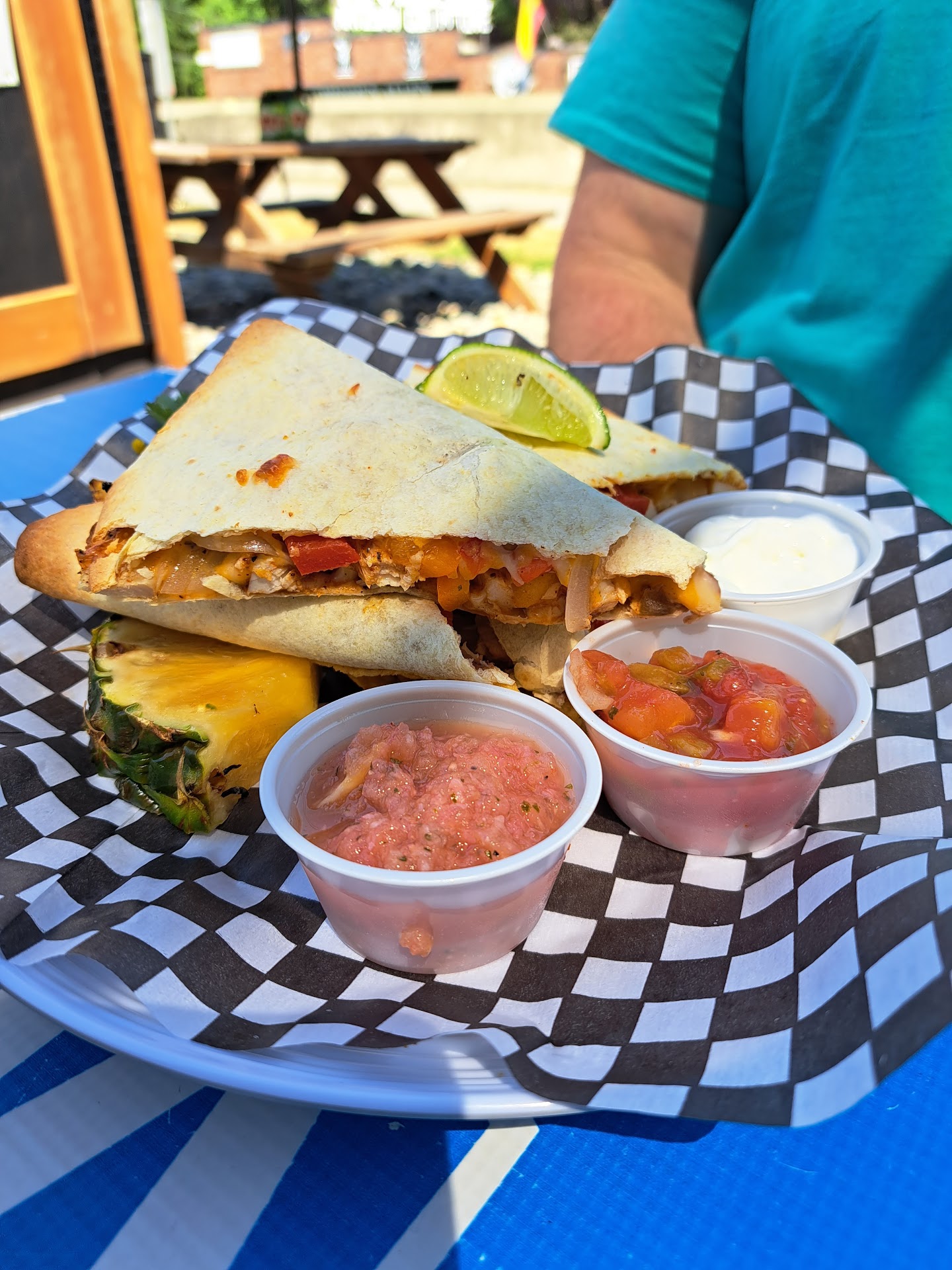 Read moreWhat an eclectic compound of fun and flavor. Amalgamation of indoor and outdoor dining spaces with a wide ranging menu of mostly hand held meals. Burgers, wraps, hot dogs, sandwiches, and a Mexican menu of tacos & burritos. A couple of salads thrown in. The service here was outstanding as Lisa(?) could not have been more friendly or accommodating. Our meal choices were a chicken quesadilla for myself and a mushroom swiss burger for DW. The tortilla was stuffed with large amounts of both grilled veggies and chicken with just the right amount of cheese to hold it all in place. Served with a very flavorful pineapple salsa. Loved every bite. The burger was very nicely done in almost all respects-grilled as ordered, fresh lettuce and tomato, and delicious grilled onions. Unfortunately, the mushrooms in the title were cooked previously and as my DW described “refrigerator cold”. I chose to bring it to our hostess attention and she could not have been more apologetic, offering to make her a new burger or taking it off of our bill. We let her know that these were not necessary, we would be okay. Just wanted to inform the kitchen. But too our pleasant surprise it had been taken off our check. Very nice gesture. A quick note on the fries-DW felt they were dusted with a seasoning blend that some may find too spicy. Even with our issue, I’d recommend stopping here for a good meal and excellent service if...