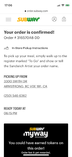 Read moreOrdered online and received an order confirmation and pick up time...arrived with a print out showing my confirmation number and was told to wait....waited fifteen minutes while she filled a phone in order. When she looked at my confirmation receipt she said she hadn't received the order and there was no proof of the Paypal payment... She phoned her supervisor who said I would have to pay again to have my order made. I pointed out that my confirmation gave the time, order number, the Armstrong Subway address but the sandwich maker said " oh your app must be out of date". I had to return home and print out the full confirmation emails from Paypal and Subway... even when I returned she said "well I'll make your order, but it's not in my computer". ...