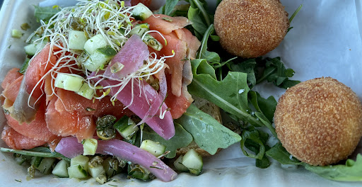 We ordered 3 items: Open face smoke salmon sandwich - the sandwich is a generous size and the ingredients are quite fresh. The combination of the ingredient between the smoked salmon, pickled onion and cucumber goes well together with the bread. I wouldn’t this is the best sandwich I ever had but its a good sandwich. The 3 potatoes ball are good, warm and creamy.