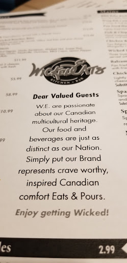 Read moreSO happy that the new owner/proprietor seems to be a nice person who is very well liked by staff as well as the regulars from the last establishment at this location, it really speaks to your brand success when you can scoop up all the loyal guests who used to frequent the "former place" 😉 We stopped in to visit our favourite staff members and have a glance at the menu so we had a couple of cold beverages and ordered wings - good wings are a big deal - I'm happy to say that the wings were excellent, my PIC is always searching for decent garlic/parm and is usually disappointed BUT not at Wicked Eats; the gar/parm is the real deal; definitely not out of a seasoning container, the parm is freshly grated from real parm! The menu looks great and I'm told that the Italian dishes are Rob's (owner) Mom's original recipes which is lovely We will definitely be returning to work our way through the menu! Updated, bright and fresh decor add to the welcoming atmosphere, well done...