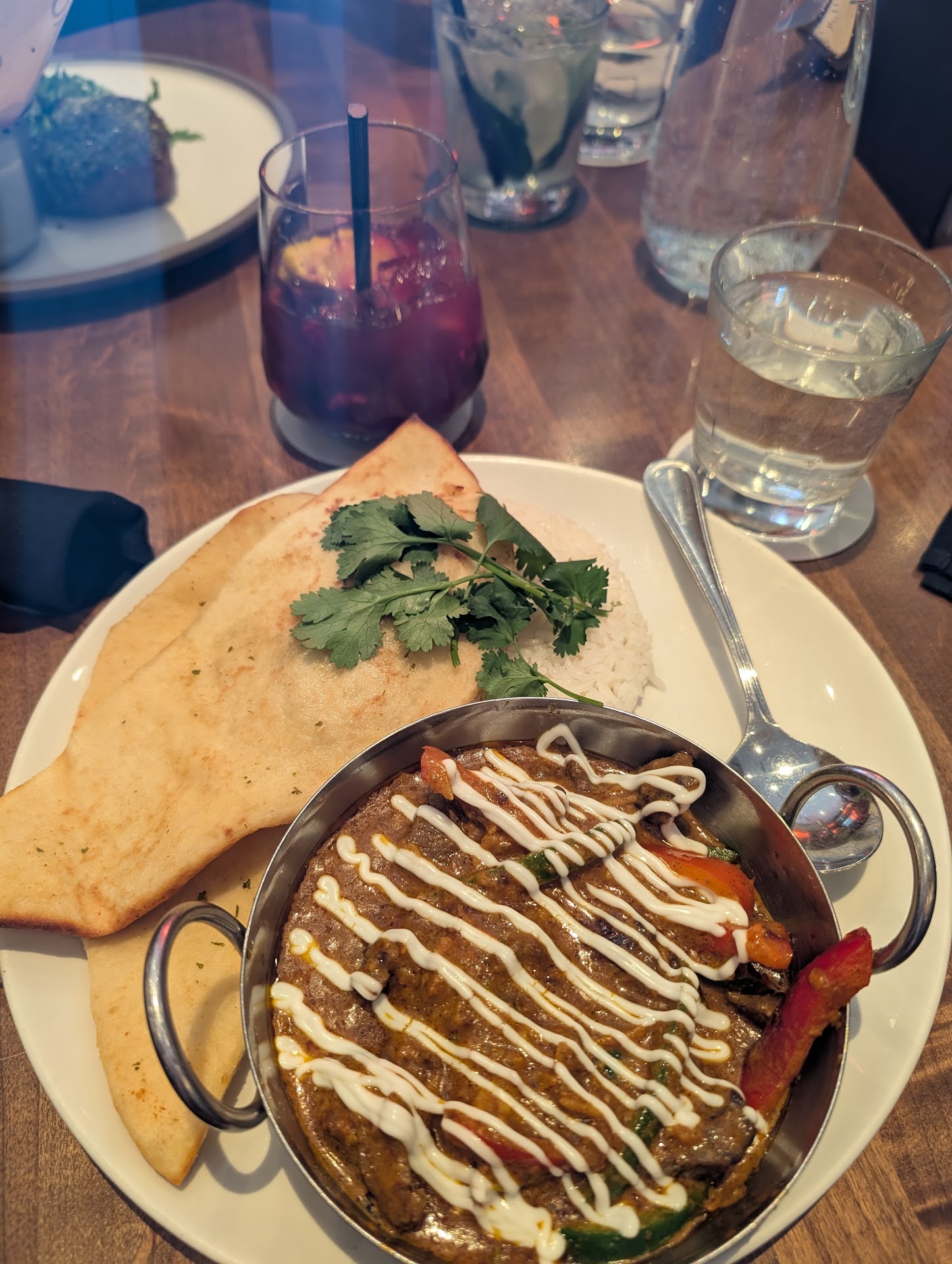 We then shared one dessert - Churro Ice Cream Sandwich ... Not so good! We were given spoons that could not cut the hot Churro top. Had to use spoons with our fingers to try to cut into this dessert (the Churro was a bit too hot to grab with fingers, but we couldn't cut it any other way). Then things went further downhill - I never saw ice-cream practically disintegrate into a puddle as fast as it did with this dessert. The Churro on top of this ice-cream sandwich was truly hot and, had the ice cream been sufficiently chilled, this would have been a fabulous dessert. (Fried ice-cream would have withstood the heat of the Churro better.) Instead, immediately upon receiving this dessert (we were the first table by the patio entrance as well as seated in the shade), as soon as we pressed down on the hot Churro to cut into it, the ice-cream patty collapsed into a puddle. We continued trying to cut the Churro as it floated around the bowl. What we were left with was sticky slightly burnt fingers and Churro pieces floating in a lake of melted ice cream that was overflowing over the sides of the bowl onto the table. All of this happened before we barely got our first bite of the dessert. Would not order this again, or would make sure we had forks and sharp knives first before getting this ice-cream sandwich in order to be able to cut into it. Eat it very quickly, or expect spoons to be used as soup spoons!