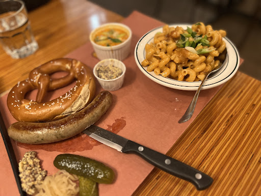 We had a full platter with sausages and sides (the Otto, Bavarian, and Jerk Chicken sausages, potato salad, mac and cheese, and coleslaw). Each item was delicious and well made. The spices in their sausage, the chill of the pickled items, and clean presentation of the platter all seemed carefully tailored for both a feast of eyes and the mouth. The tavern-esque atmosphere with shared food made for a cozy, intimate, yet lively dinner. We had a WONDERFUL experience, and never once felt rushed or treated any differently than if we hadn't placed a reservation. We were able to soak in the experience, and we enjoyed it so much ❣️