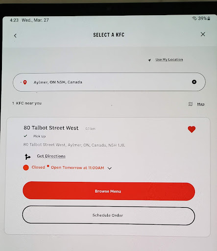 Read moreGood job KFC in Alymer. My wife and I decided to take a drive from Georgetown to Alymer today to visit friends. We stopped at KFC to pick up lunch for the 4 of us. Decided on the Triple Bucket Deal. I call it a deal because we found a 25% off coupon on line. There was more more than enough food for all of us. I asked for the chicken to be cooked slightly more than the norm. It was perfect. Chicken was tender and still juicy. Chicken wings tasty and crunchy. I thought everything was perfect. I don’t know what anyone could ever complain about. I have read some of the bad reviews and I don’t understand what people expect. My god, it’s a fast food outlet. They should leave their attitudes at home. It’s not like Mom would make but still good for what is is. FAST FOOD. Yes, the place could use a paint job but so what. Good job KFC Alymer. We will return. Bruce and Linda. Georgetown, Ontario. Saturday...